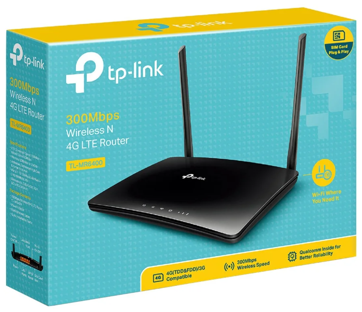TL-MR6400 300Mbps Wireless N 4G LTE Router, build-in 4G LTE modem, support LTE-FDD/LTE-TDD/DC-HSPA+/HSPA+/HSPA/UMTS/EDGE/GPRS/GSM, with 3x10/100Mbps LAN ports and 1x10/100Mbps LAN/WAN port, 300Mbps at 2.4GHz, 802.11b/g/n, 2 internal Wi-Fi antennas, 2 detachable LTE antennas.